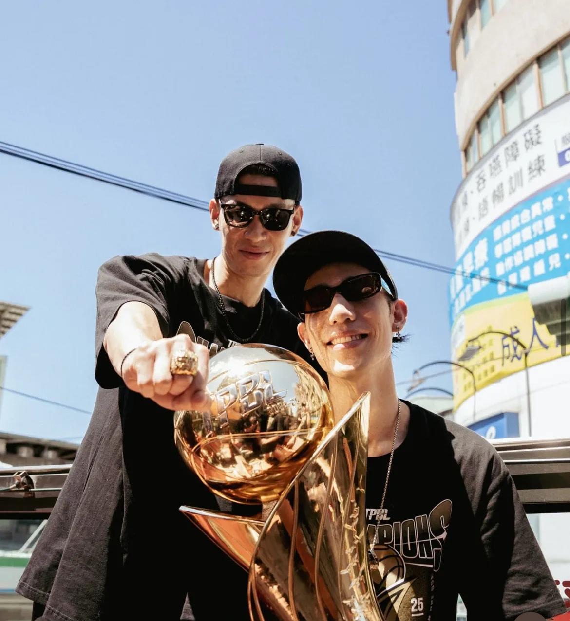 林书豪与弟弟成为队友,手捧冠军奖杯/图片来源:林书豪Instagram