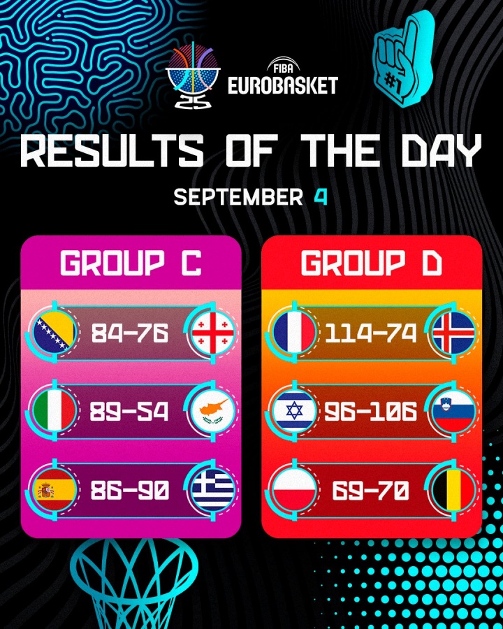 当地时间9月4日,男篮欧锦赛六场小组赛全部结束,具体赛况如下:
