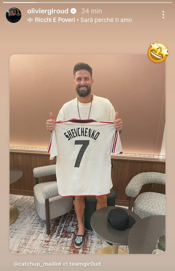 吉鲁虽然已经离开了AC米兰,但他依旧与米兰保持着紧密的关系,他在社交媒体晒出了一件自己获赠的舍甫琴科7号米兰球衣。